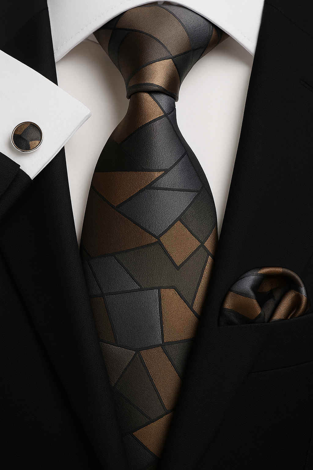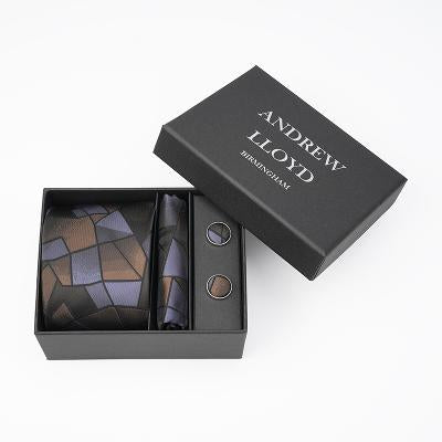 Turn classic geometry into bold style. This striking tie features an artistic mosaic of bronze, charcoal, and slate shades layered in an abstract grid. Woven from 100% silk, it’s a sophisticated option for creative professionals and evening affairs alike. Complete with matching pocket square and cufflinks for elevated coordination.