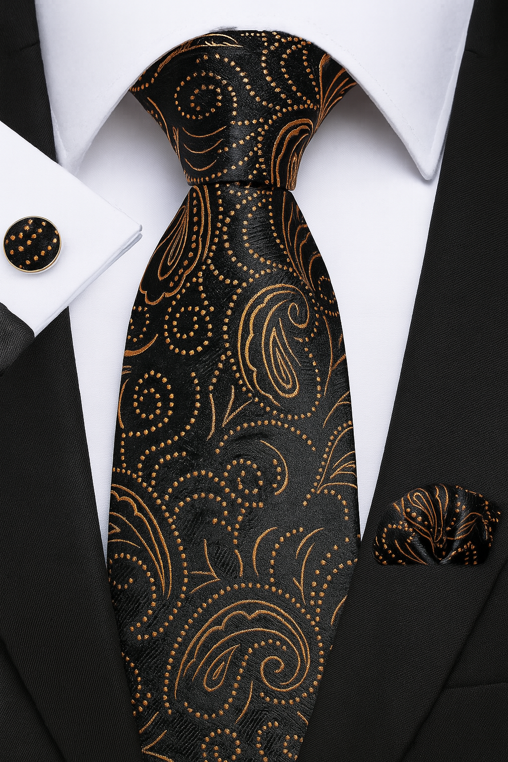Dare to impress. This tie fuses bold copper swirls with a matte black silk backdrop for an energetic, artistic look. For those who like their formality with flair.