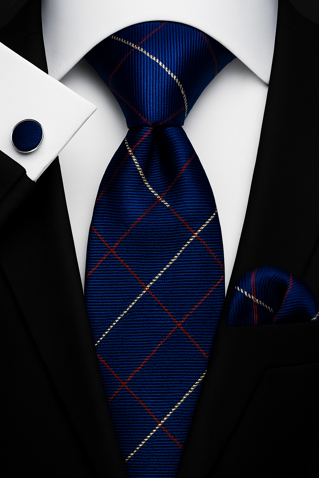 Andrew Lloyd 100% Silk Tie – Deep Blue with Red Grid