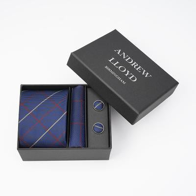 This tie strikes the perfect balance between bold and classic. Rich navy blue silk is crisscrossed by a refined red and ivory check, making it an essential accessory for business and evening wardrobes. Accented with matching pocket square and cufflinks.