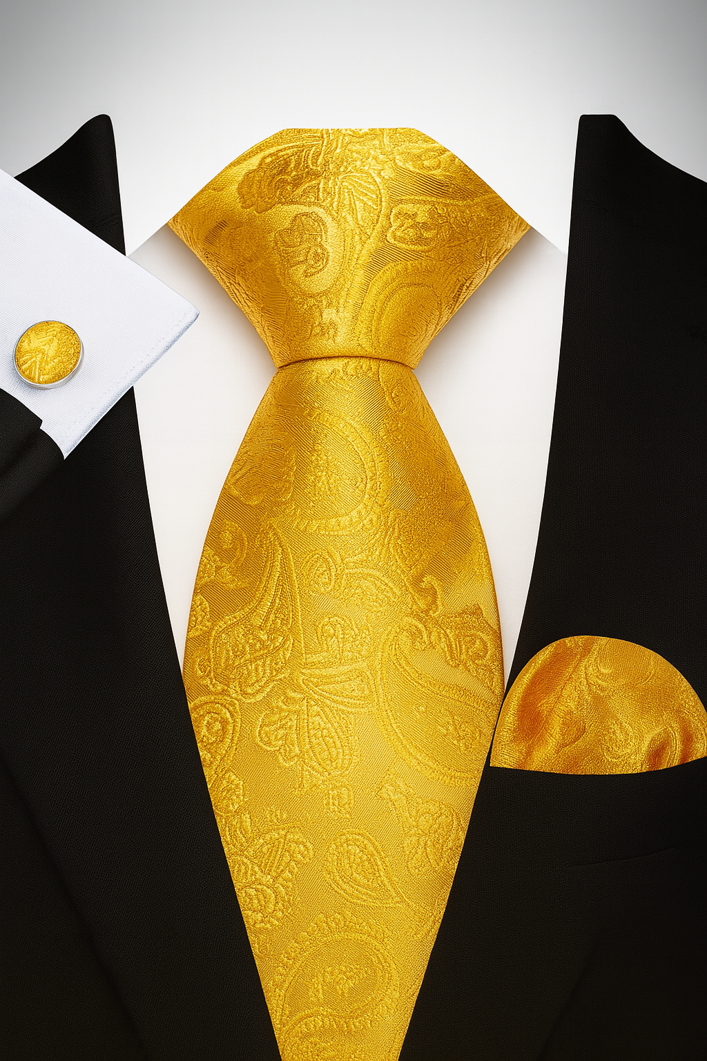 This golden silk tie is a showstopper. With its regal paisley embossing and lustrous finish, it captures attention without saying a word. Ideal for weddings, holidays, or any occasion deserving gold-standard style.