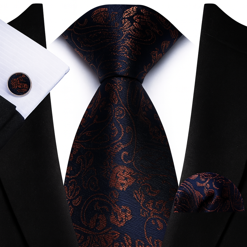 This opulent tie pairs a midnight navy base with regal red floral overlays, evoking a sense of baroque richness. Crafted in pure silk, it’s a perfect blend of drama and class for statement-makers and confident dressers. Includes matching accessories for a polished finish.
