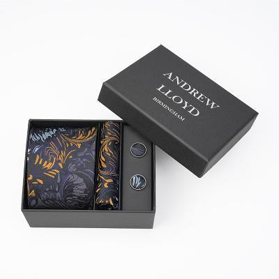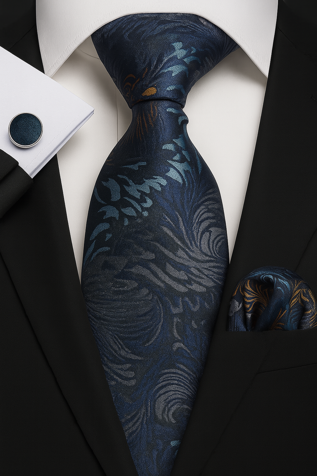 Artfully inspired by nature. This elegant tie features a midnight blue base with swirling feather-like motifs in steel grey and bronze tones. It’s a choice for men who appreciate texture, detail, and a touch of the unexpected. Comes as a full set.