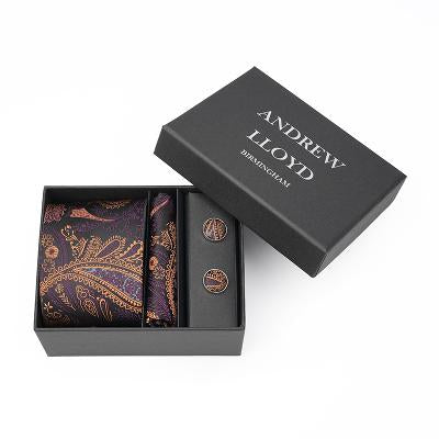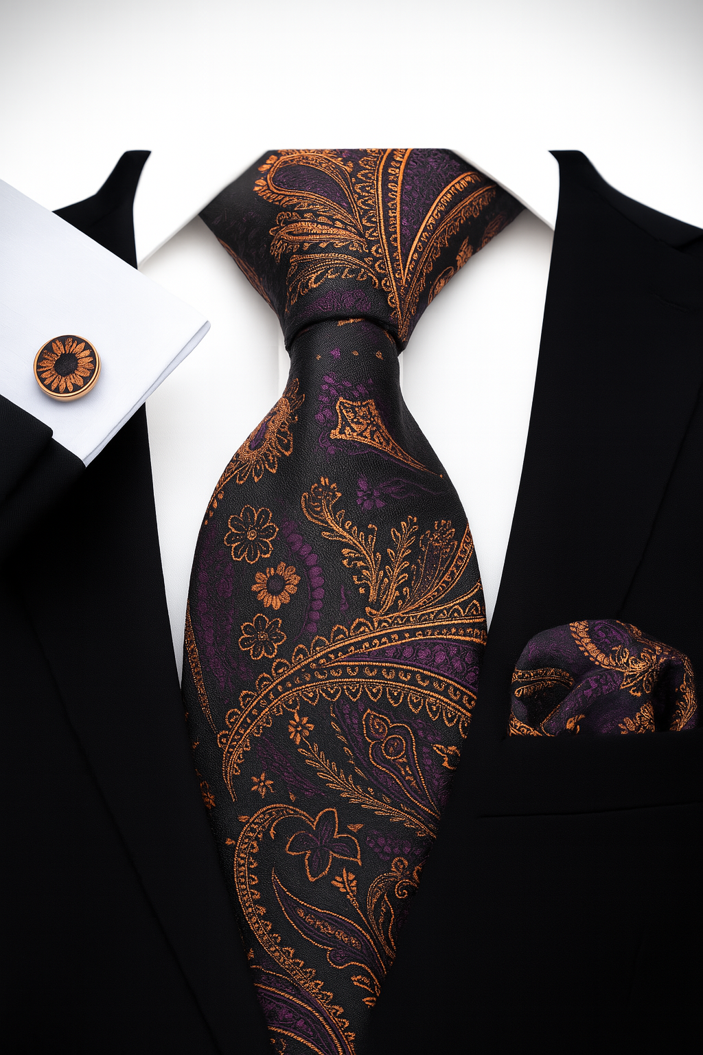 Where timeless elegance meets daring contrast. This luxurious black silk tie is embroidered with luminous copper and purple paisley details. The deep hues shimmer subtly, making it the perfect statement piece for black-tie events or formal nights. Comes with coordinated pocket square and cufflinks.